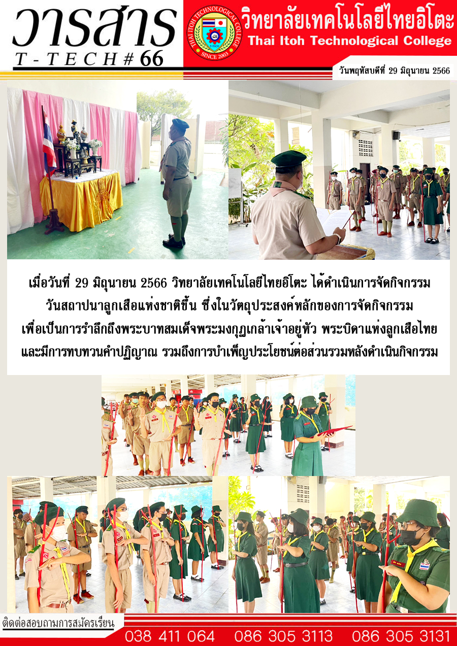 เมื่อวันที่ 29 มิถุนายน 2566 วิทยาลัยเทคโนโลยีไทยอิโตะได้ดำเนินการจัดกิจกรรมวันสถาปนาลูกเสือแห่งชาติขึ้น ซึ่งในวัตถุประสงค์หลักของการจัดกิจกรรม เพื่อเป็นการรำลึกถึง พระบาทสมเด็จพระมุงกุฎเกล้าเจ้าอยู่หัว พระบิดาแห่งลูกเสือไทย และมีการทบทวนคำปฏิญาณรวมถึงการบำเพ็ญประโยชน์ต่อส่วนรวมหลังดำเนินกิจกรรม