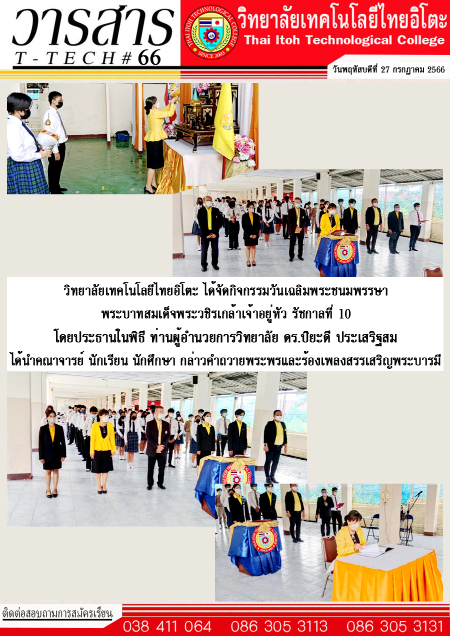 วิทยาลัยเทคโนโลยีไทยอิโตะได้จัดกิจกรรมวันเฉลิมพระชนมพรรษา พระบาทสมเด็จพระวชิรเกล้าเจ้าอยู่หัว รัชกาลที่ 10 โดยประธานในพิธีท่านผู้อำนวยการวิทยาลัย ดร.ปิยะดี ประเสริฐสม ได้นำคณะผู้บริหาร คณาจารย์ นักเรียน นักศึกษา กล่าวคำถวายพระพรและร้องเพลงสรรเสริญพระบารมี #ขอพระองค์ทรงพระเจริญ #ด้วยเกล้าด้วยกระหม่อมขอเดชะ ข้าพระพุทธเจ้า ผู้บริหาร คณาจารย์ เจ้าหน้าที่ นักเรียน นักศึกษา วิทยาลัยเทคโนโลยีไทยอิโตะ