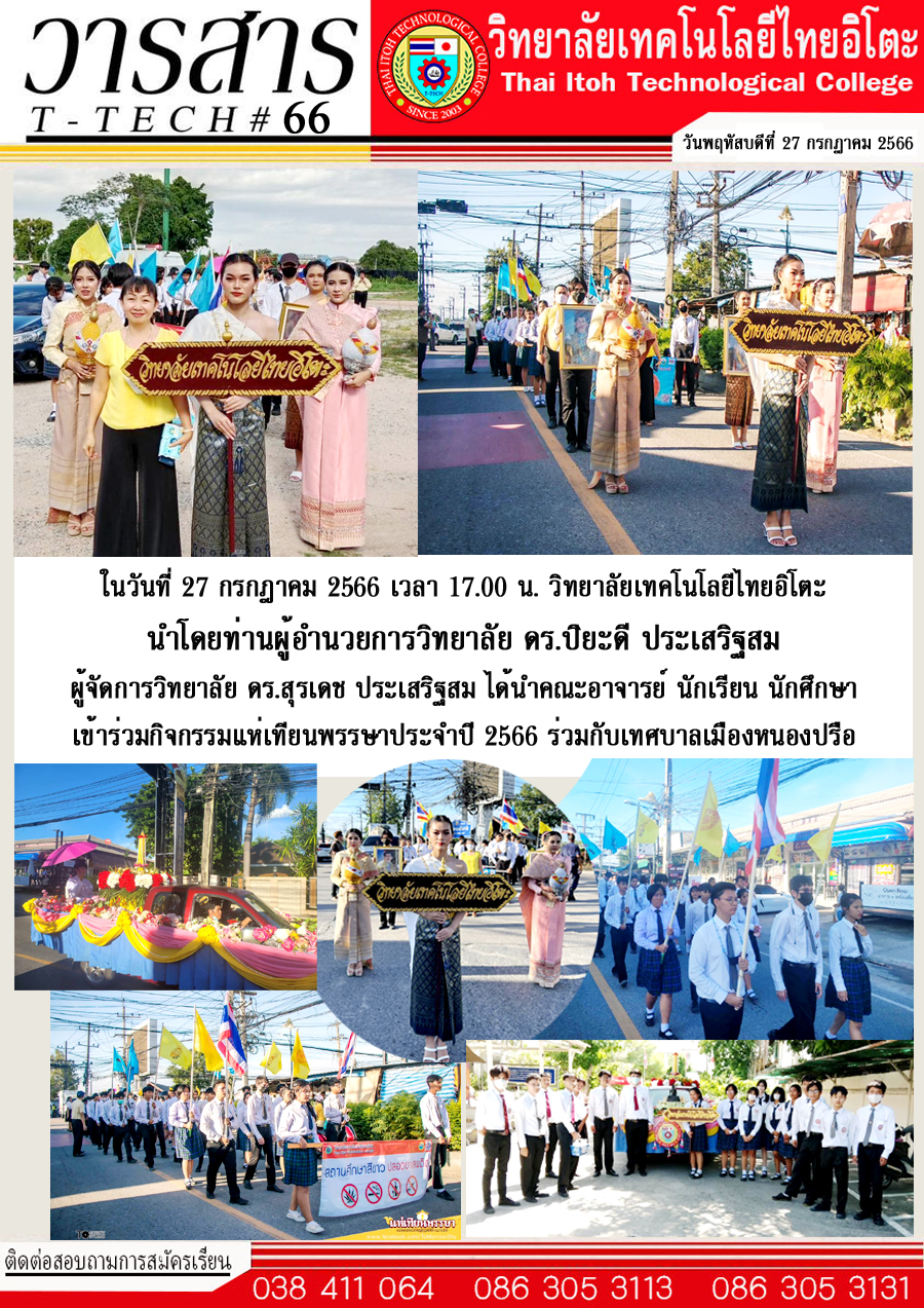 ในวันที่ 27 กรกฎาคม เวลา 17.00 น. วิทยาลัยเทคโนโลยีไทยอิโตะ นำโดยท่านผู้อำนวยการวิทยาลัย ดร.ปิยะดี ประเสริฐสม ผู้จัดการวิทยาลัย ดร.สุรเดช ประเสริฐสม ได้นำคณะอาจารย์ นักเรียน นักศึกษา เข้าร่วมกิจกรรมแห่เทียนเข้าพรรษาประจำปี 2566 ร่วมกับเทศบาลเมืองหนองปรือ