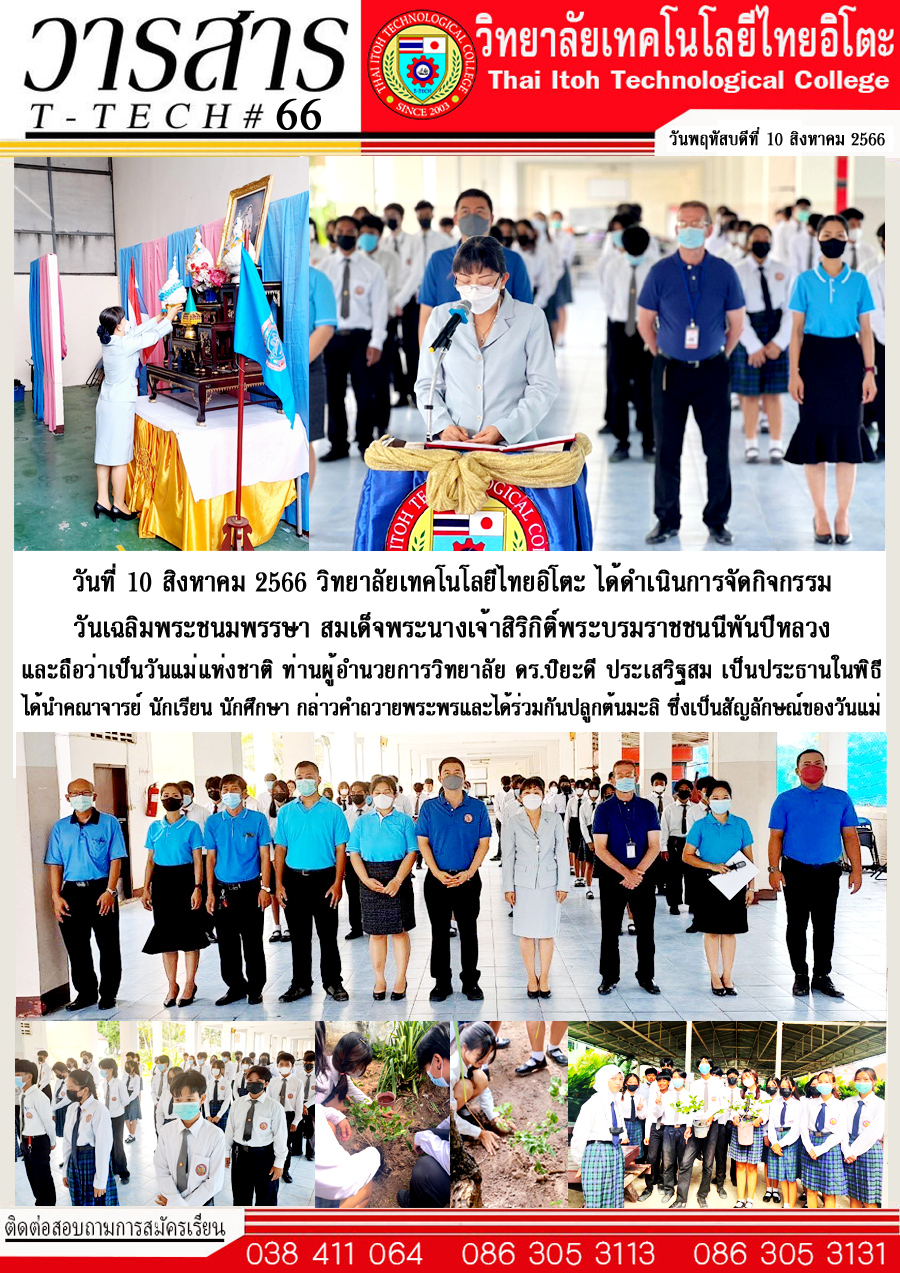 วิทยาลัยเทคโนโลยีไทยอิโตะได้ดำเนินจัดกิจกรรมวันเฉลิมพระชนมพรรษาสมเด็จพระนางเจ้าสิริกิติ์พระบรมราชชนนีพันปีหลวงและถือว่าเป็นวันแม่แห่งชาติ โดยท่านผู้อำนวยการวิทยาลัยเทคโนโลยีไทยอิโตะ ดร.ปิยะดี ประเสริฐสม เป็นประธานในพิธี ได้นำคณาจารย์ นักเรียน นักศึกษา กล่าวคำถวายพระพรและได้ร่วมกันปลูกต้นมะลิซึ่งเป็นสัญลักษณ์ของวันแม่